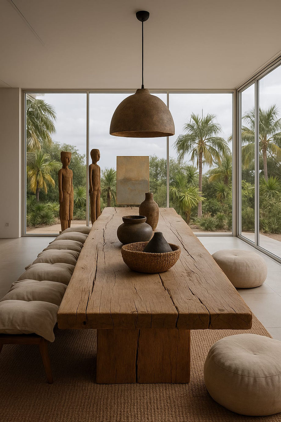 Elementos artesanales como jarrones de barro, lámparas en fibras naturales y acabados trabajados a mano.